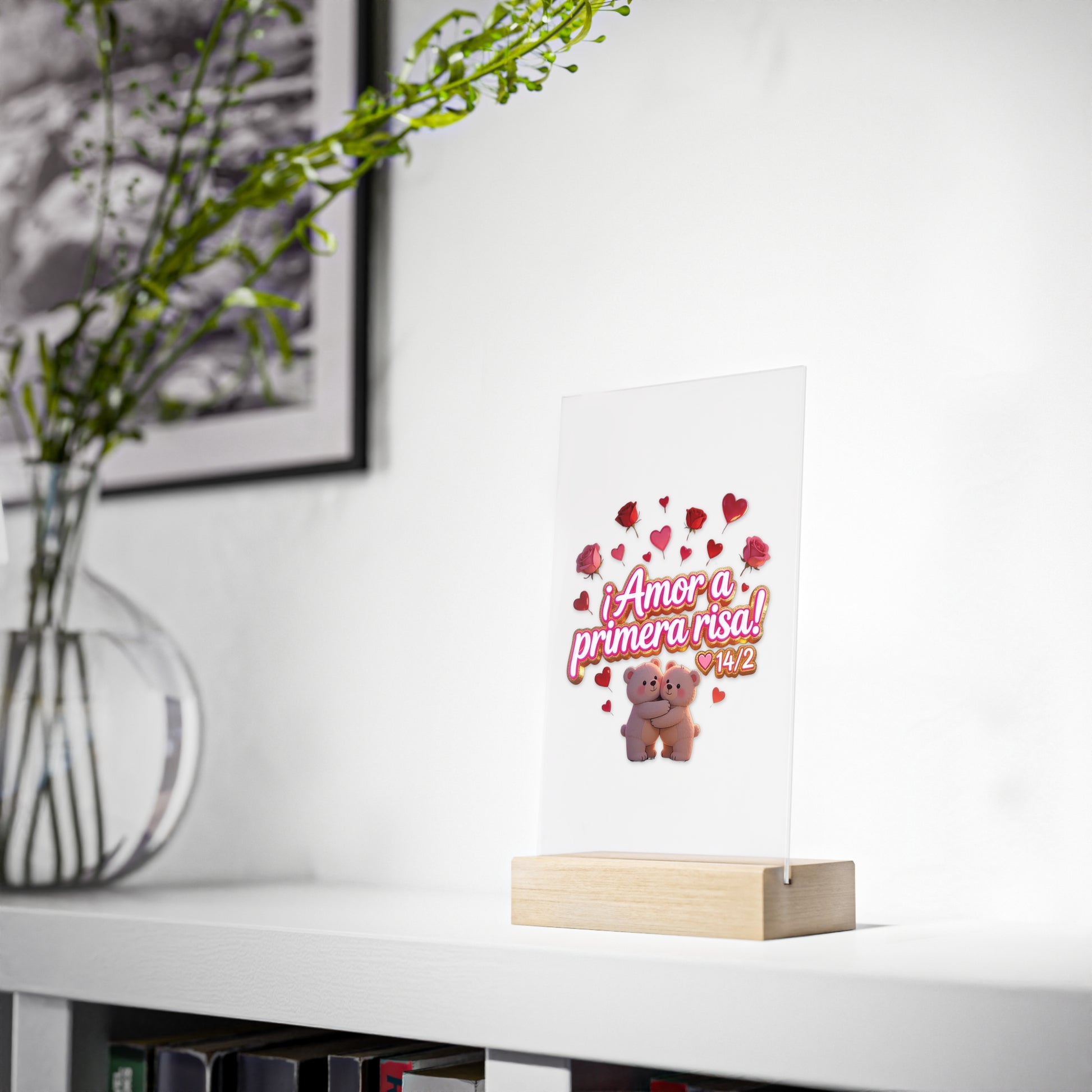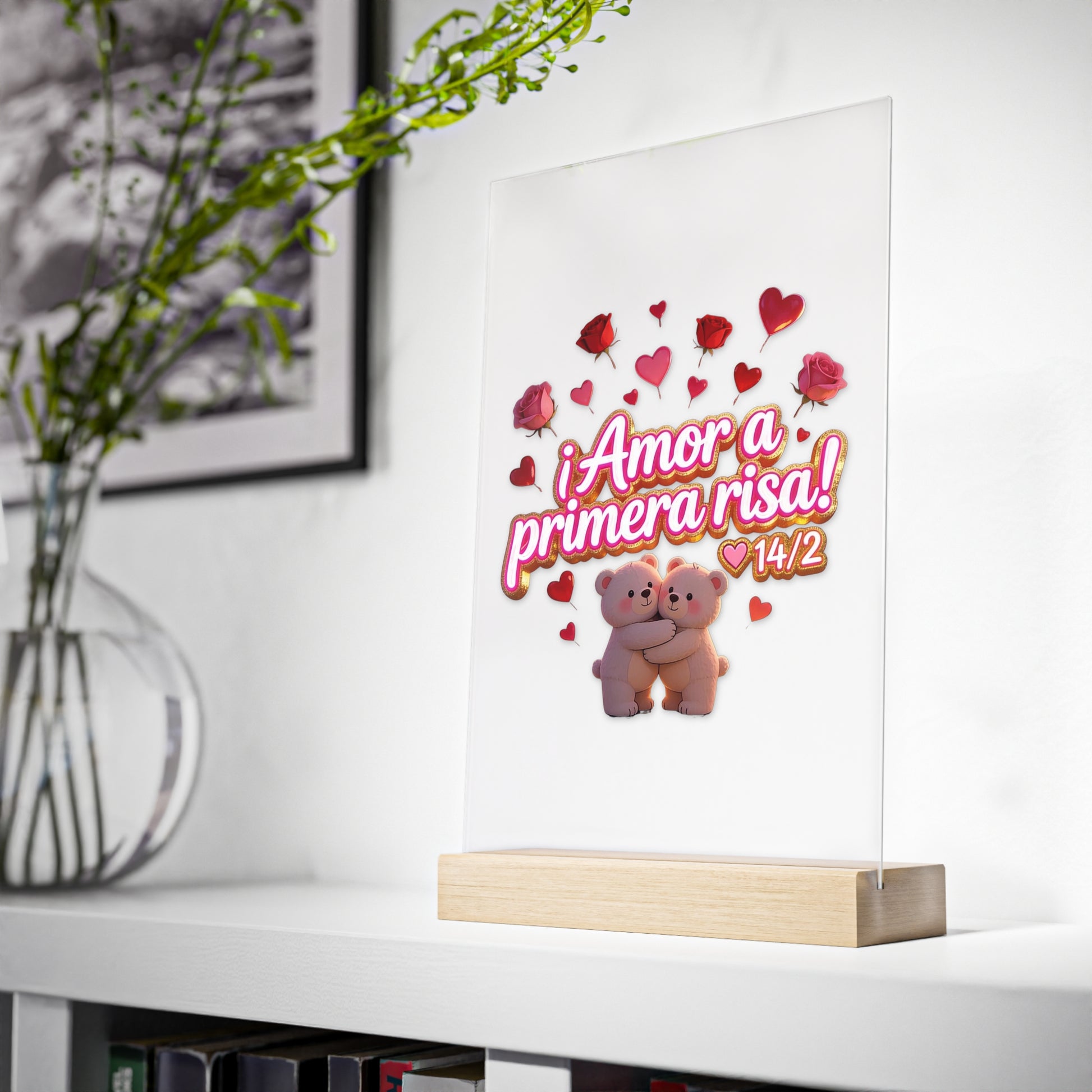 Un delicado expositor acrílico que evoca un pequeño momento de alegría: un panel transparente de 3 mm impreso con ilustraciones vívidas de alta resolución, sobre un cálido soporte de madera de origen sostenible. El diseño muestra personajes alegres y cariñosos rodeados de corazones y rosas con la frase "¡Amor a primera risa! 14/2", que aporta un toque ligero y romántico a escritorios, mesitas de noche o estanterías. Es como un pequeño recuerdo que puedes ojear entre correos electrónicos o colocar en la mesita de noche para empezar y terminar el día con una sonrisa. Su diseño estilizado y su nítida impresión hacen que la obra parezca flotar sobre la madera, aportando un toque moderno y acogedor a cualquier espacio pequeño.