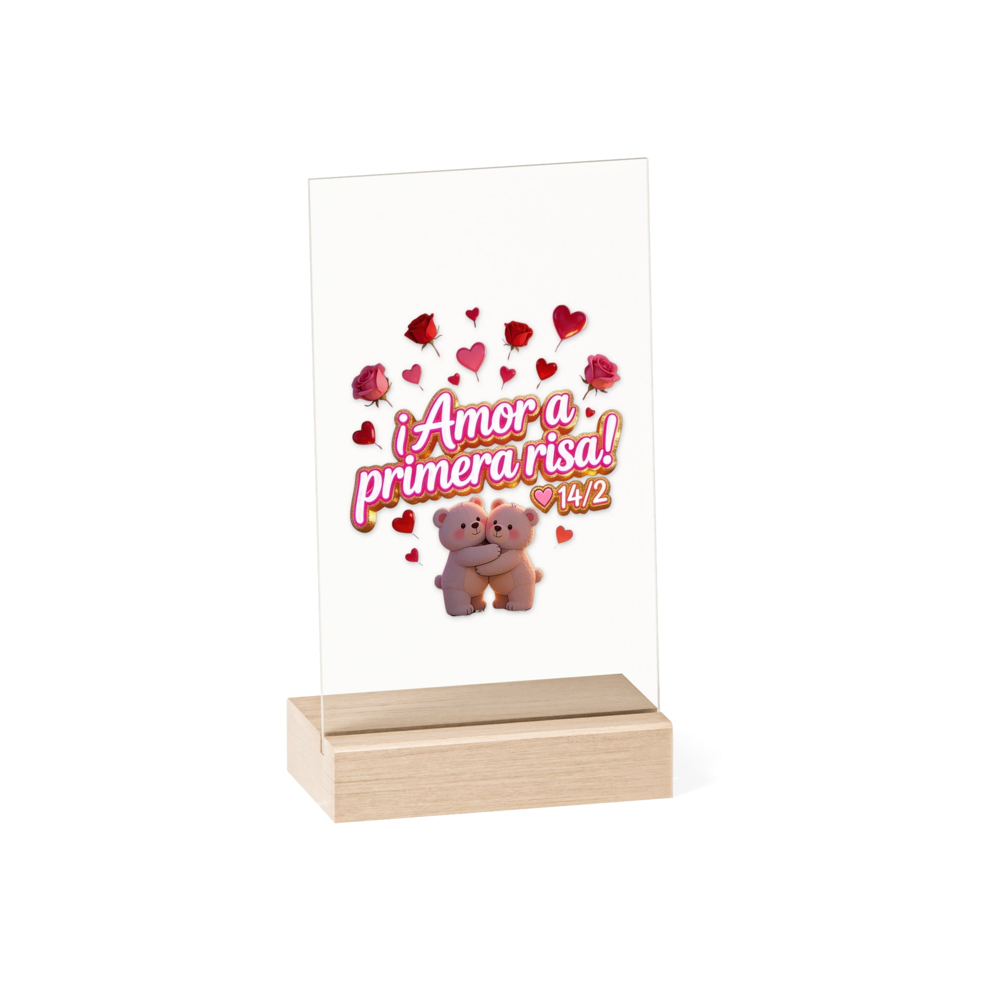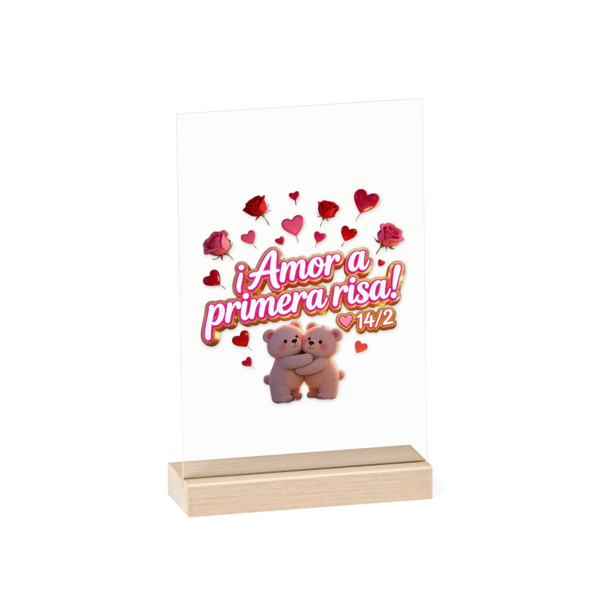 Acrylic Sign — "Amor a Primera Risa" Valentine’s Desk Decor (Wooden Stand)