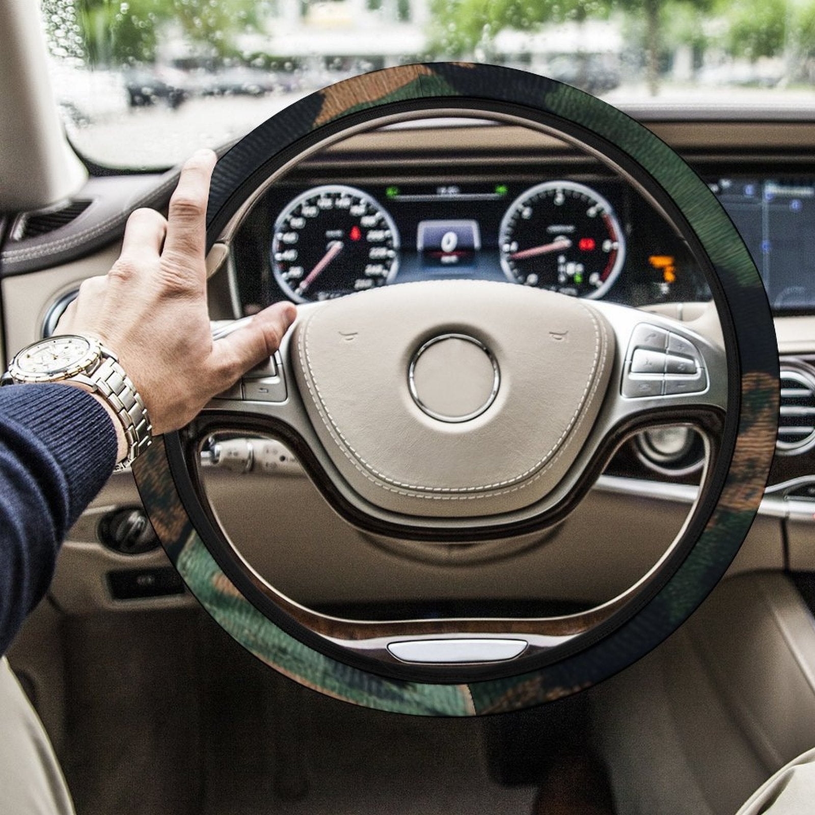 El estilo camuflaje militar para el interior de tu coche. 🎖️🚗 Funda de volante de neopreno con patrón de manchas verde oscuro. Ecológica, suave al tacto y antideslizante. ¡Un toque táctico y moderno para tu conducción!