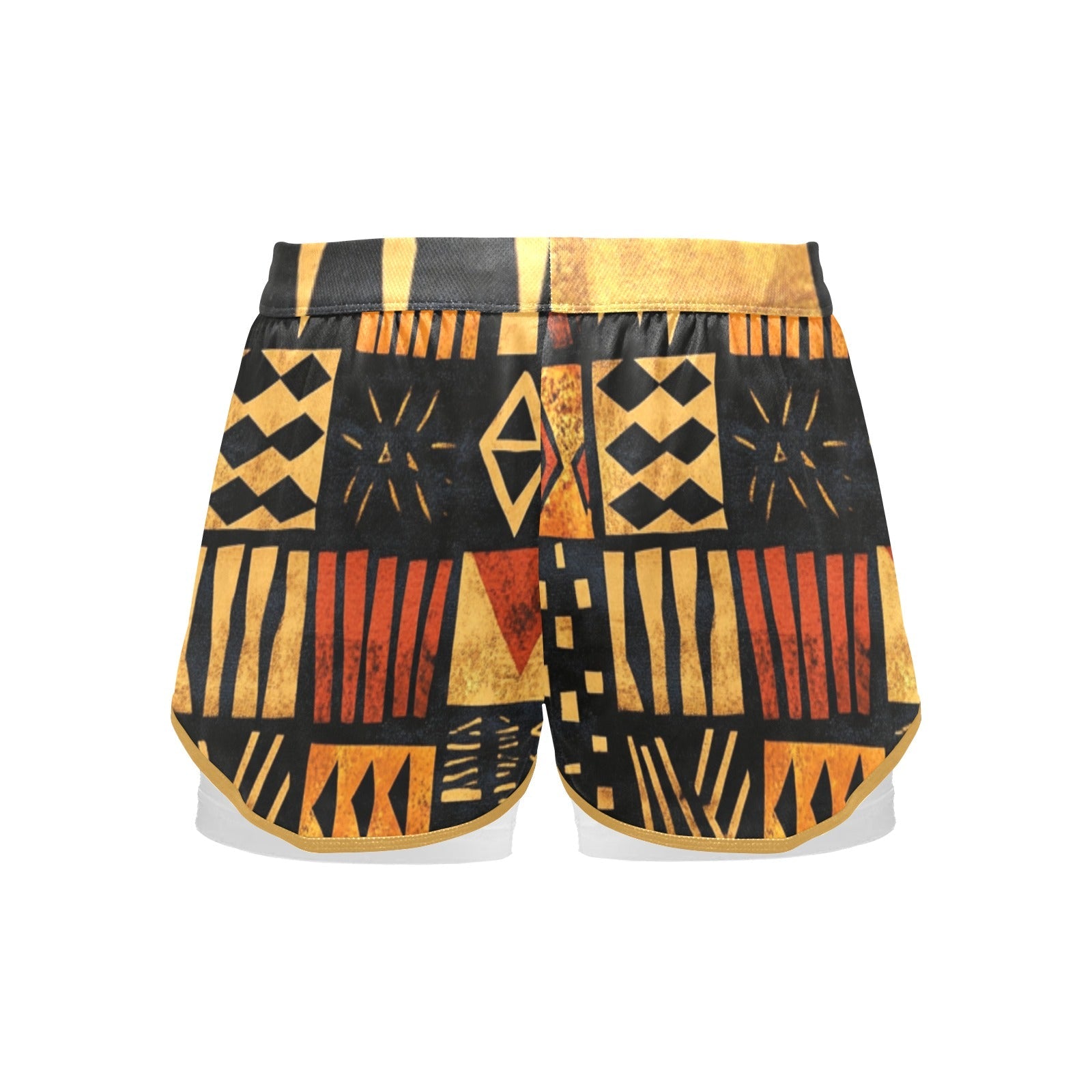 Shorts deportivos elegantes, funcionales y cómodos. 🏃♀️🌍 Con forro de compresión y patrones tribales africanos. El exterior 100% poliéster te mantiene seco. Ideales para nadar, surfear, correr o ir al gimnasio. ¡Versatilidad y estilo en uno!