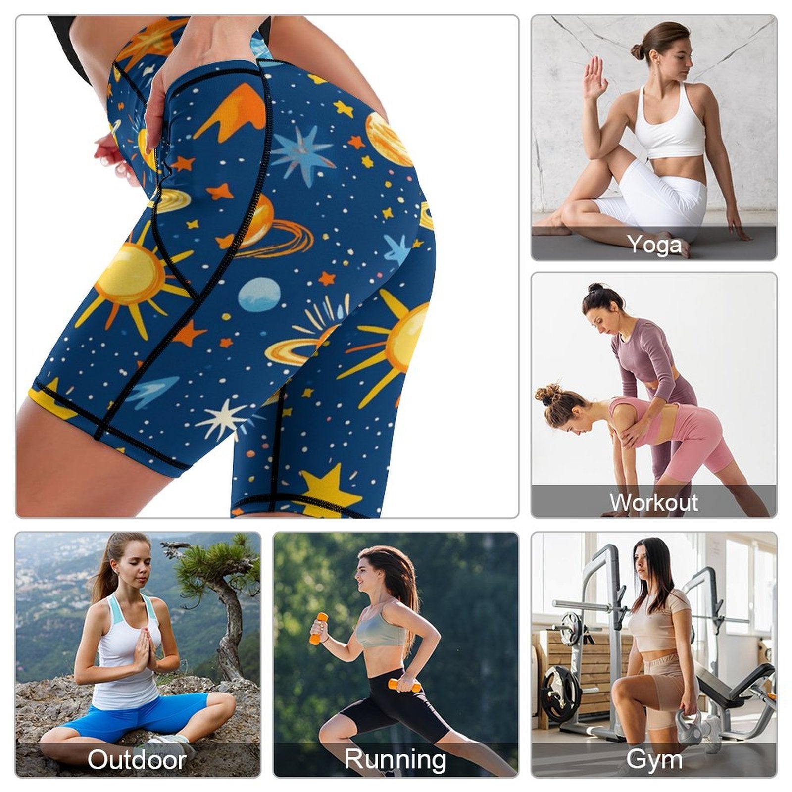 Muévete con total libertad y un diseño galáctico. 🪐🧘♀️ Pantalones cortos de yoga hasta la rodilla con patrón de espacio cósmico. Hechos de poliéster y elastano, suaves, cómodos y transpirables. ¡Perfectos para yoga, running o uso diario!