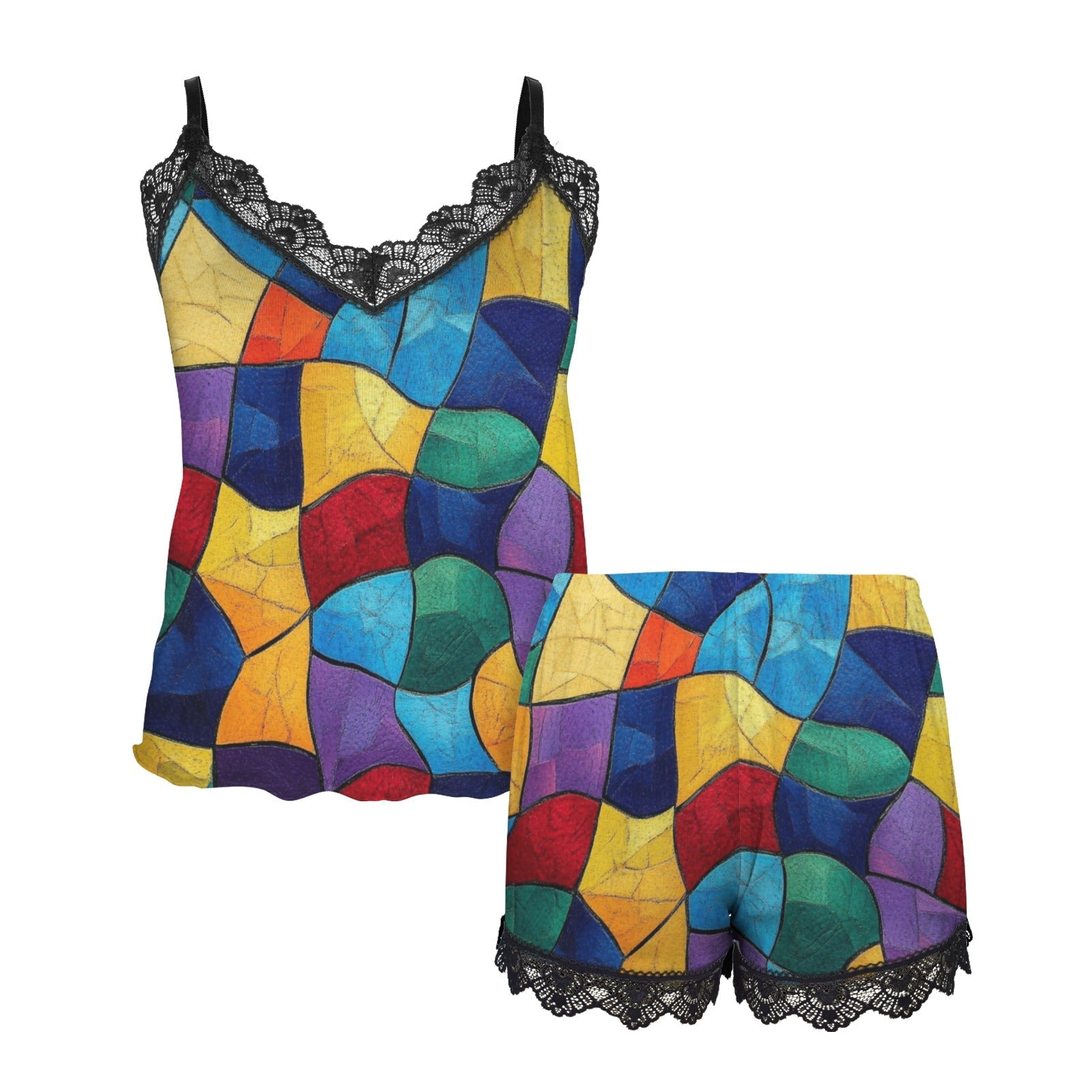 Luce un look de pijama favorecedor con la camisola y los shorts de encaje. 😴🌈 Patrones de dibujos de vidrieras de colores. 100% poliéster, suave y ligero. ¡Perfecto para dormir y relajarse en casa con elegancia!