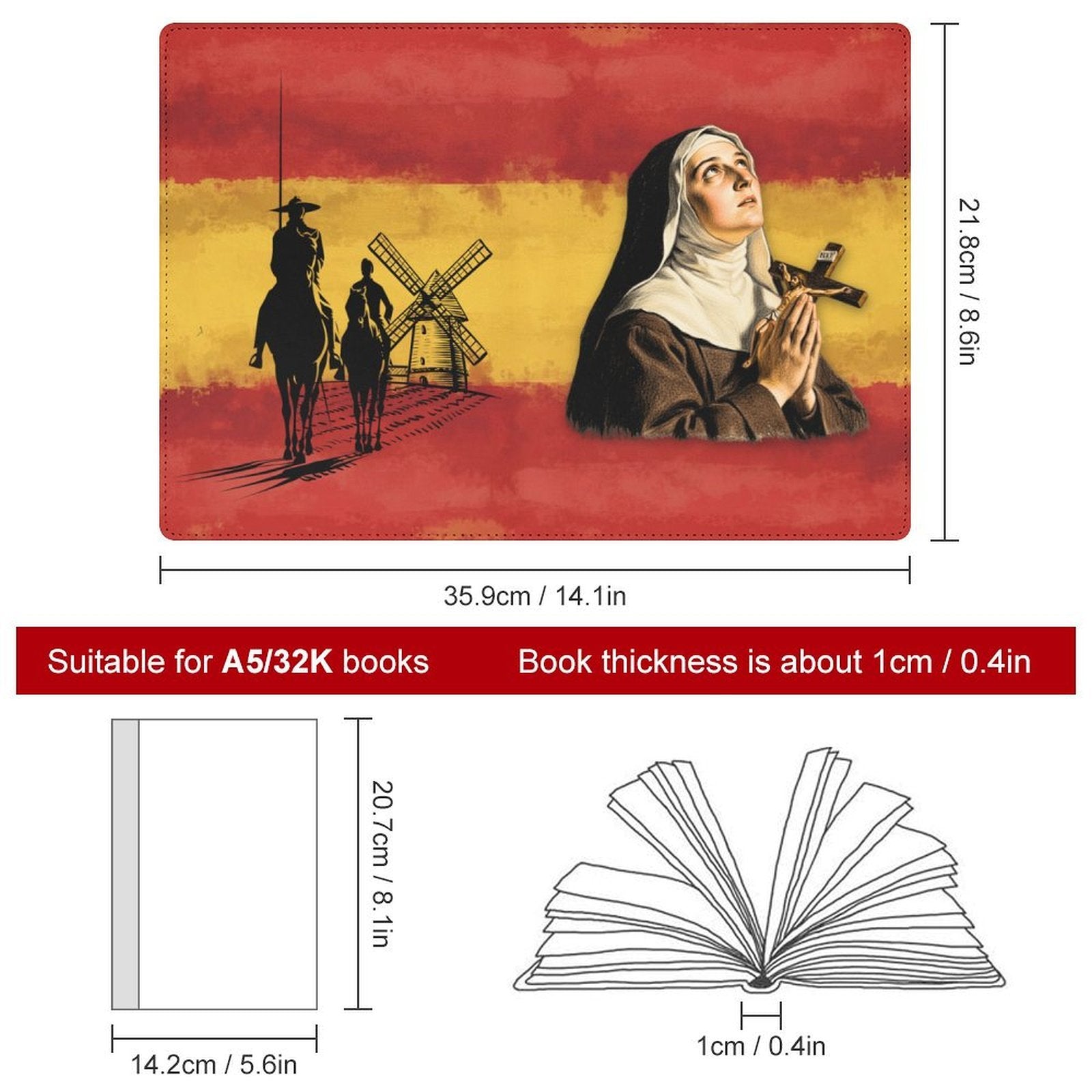 Ideal para lectores de espiritualidad cristiana, historia de España y devoción mariana, el diseño integra siluetas icónicas de Don Quijote y Sancho y molino de viento (símbolo quijotesco español) y la figura serena de la santa, invitando a una reflexión sobre la identidad nacional forjada en fe y sacrificio.